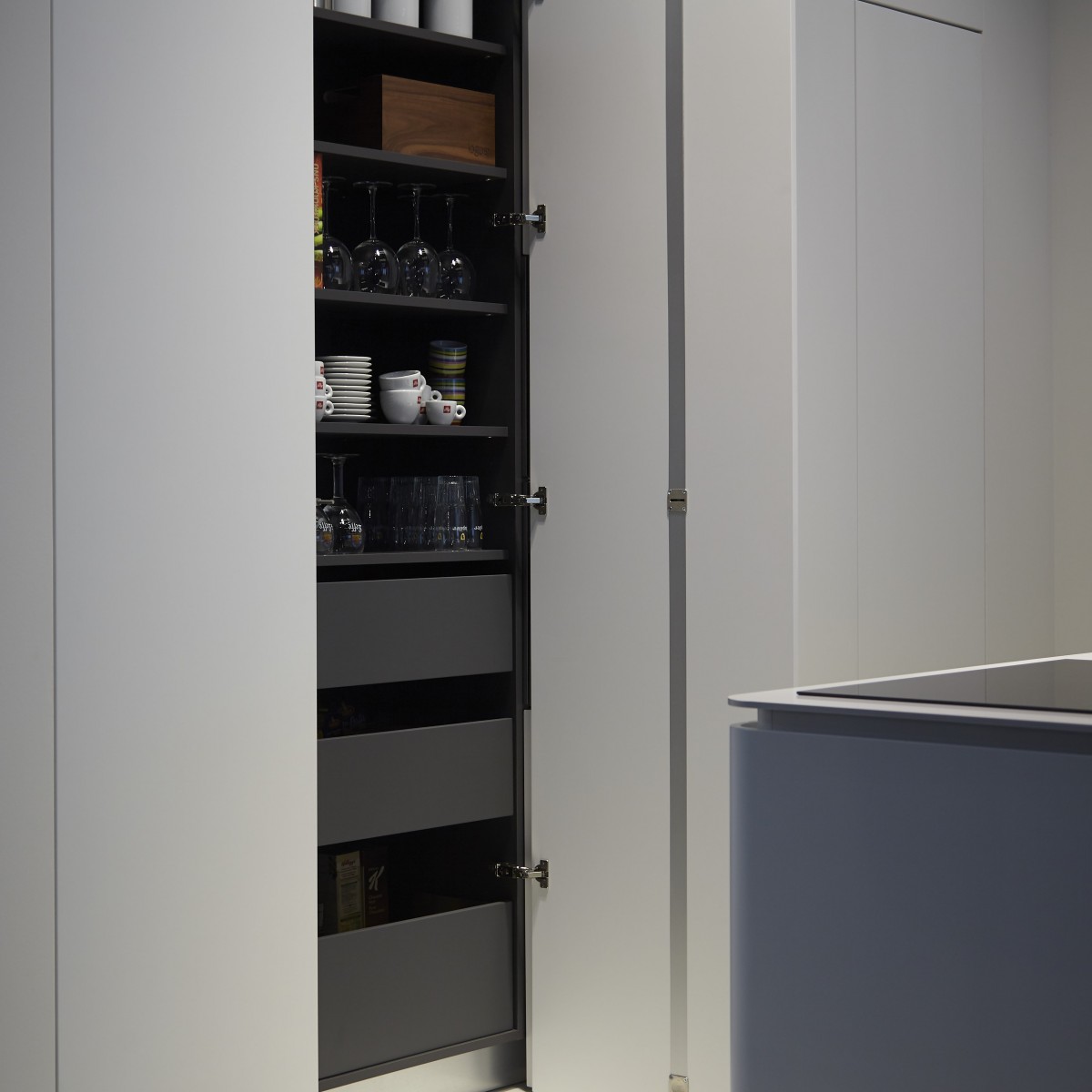 Naast een indrukwekkend eiland en een extreem handige kolomkastenwand (met twee afsluitbare extra werkzones) wordt de doorgang gemaakt naar een achterliggende berging waarin zowel wasmachine als droogkast een functionele presentatie krijgen: op werkhoogte en eveneens weggewerkt in een kastenwand. Het geheel is uitgewerkt in de gloednieuw ontwikkelde serie S5: een combinatie van greeplijsten met greeploze bediening.